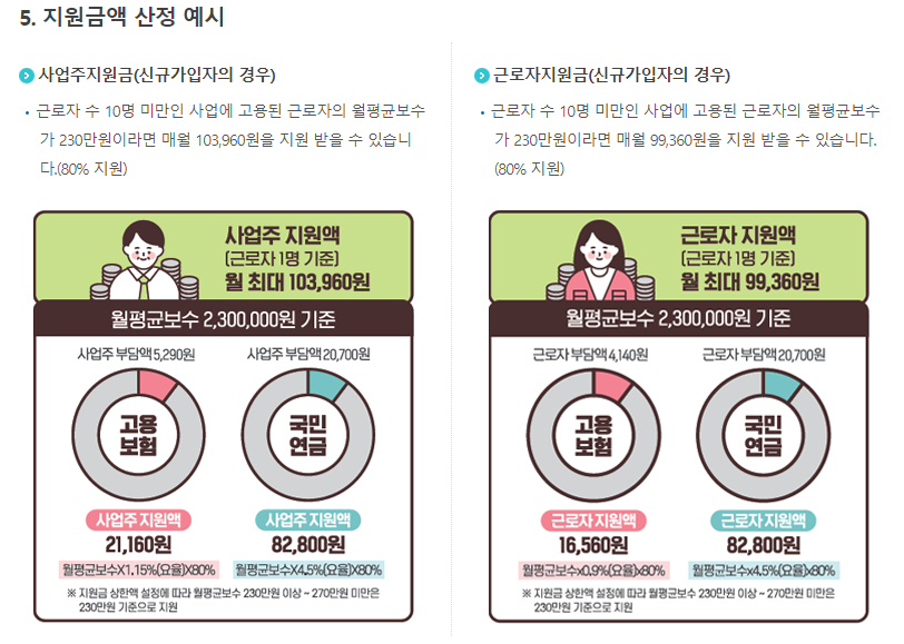 - 고용보험과 국민연금 보험료의 80%를 지원합니다. (월 소득 230만 원 미만)
