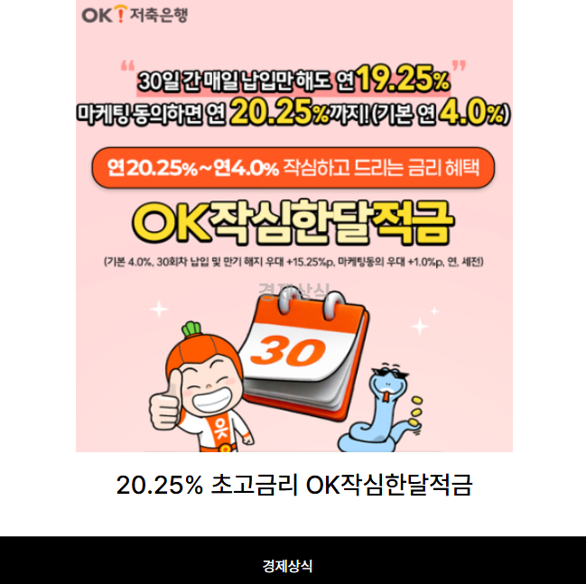 OK저축은행은 예전부터 고금리 상품으로 유명했죠. 이번에 출시된 OK작심한달적금은 그 이름처럼 딱 한 달 동안만 진행되는 특별한 상품입니다. 20.25%라는 놀라운 금리 덕분에 출시 당일 앱이 마비될 정도로 엄청난 인기를 끌었습니다. 짧은 기간 동안 목돈을 굴리고 싶어 하는 사람들의 니즈를 정확히 파악한 상품이라고 할 수 있습니다.